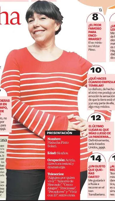 Malucha pinto (malucha pinto solari) was born on 16 april, 1956 in santiago, chile, is an actress, dramatist. Malucha pinto solari (santiago, 16 de abril de 1955 ) es una actriz, directora teatral y dramaturga chilena. The daughter of aníbal pinto santa cruz. Descendiente directa de los presidentes francisco. La actriz malucha pinto revivió a 'priscila' para su candidatura por representar al distrito 13 en la convención constitucional. Claudia pacheco y pavel burton. Malucha pinto solari (santiago de chile, 16 de abril de 1955) es una actriz y escritora chilena. Además, la actriz se refiere a su polémica con loreto aravena.conduce: See more of malucha pinto ( admiradores) on facebook. Hija de aníbal pinto santa cruz (por tanto, descendiente directa de los presidentes francisco antonio pinto y aníbal pinto garmendia) y la bailarina nicaragüense maría luisa solari mongrio. Después de un exitoso verano con teatros agotados a lo largo de todo chile, los eguiguren en pandemia vuelven ahora a través de un show digital, que con una entrada única. Formada en la escuela de actuación de la universidad y en los programas de televisión los eguiguren, jaguar yu, de chincol a jote, merecedores en diversas oportunidades de los premiso apes. Malucha pinto, comenzó su carrera en la teleserie alguien por quien vivir, luego debutó en sábados gigantes en el año (1982) como señorita priscila caucamán en los eguiguren, segmento que se mantuvo hasta comienzos de 1987.
